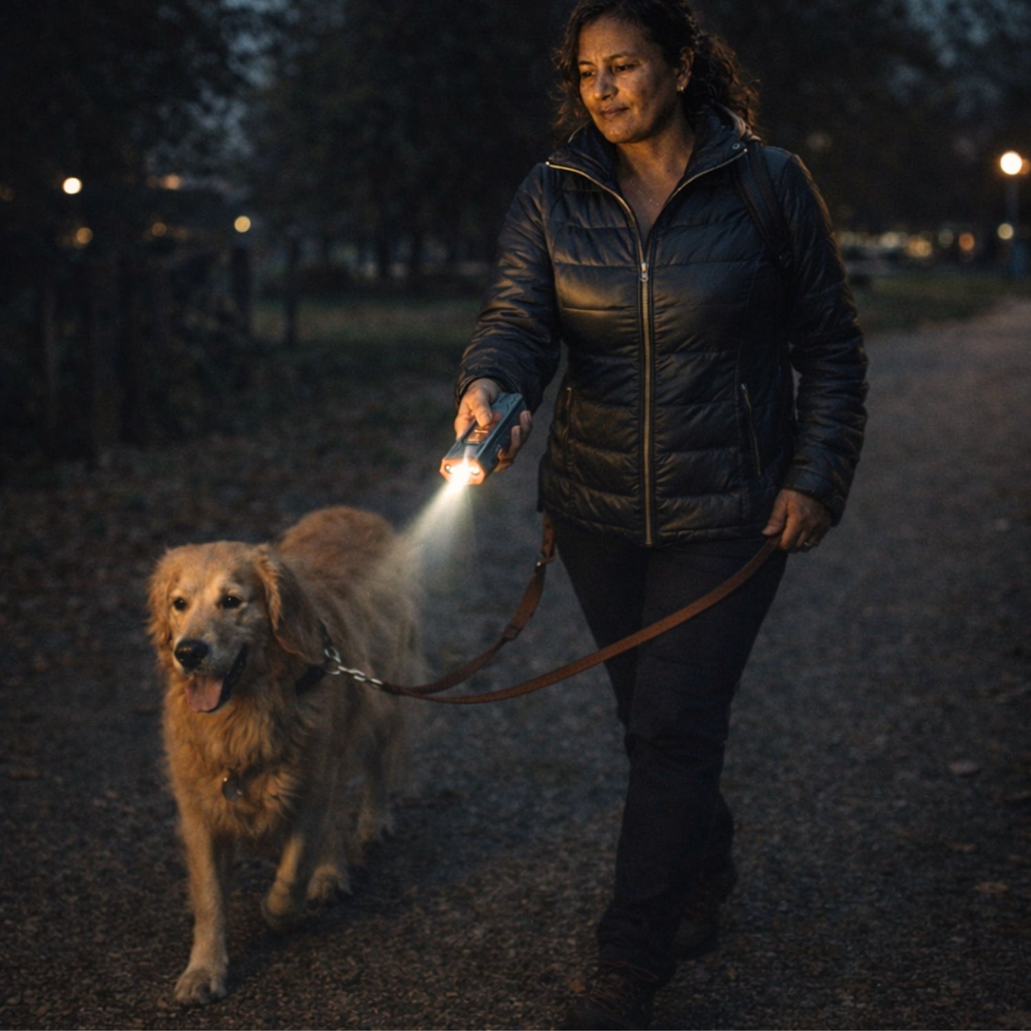 Use the Integrated Flashlight for night safety and pair with verbal cues to build lasting, positive habits.